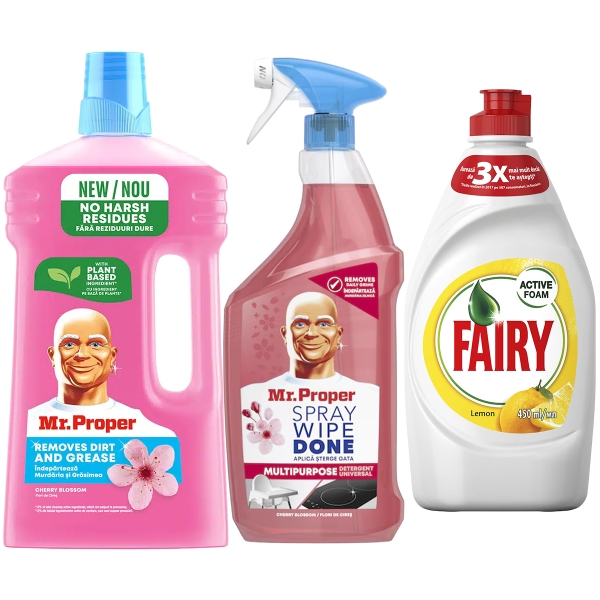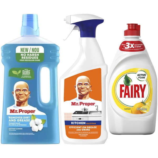 PACHET MR PROPER PARDOSELI 1L+MR PROPER BUCATARIE 800ML+FAIRY 450ML